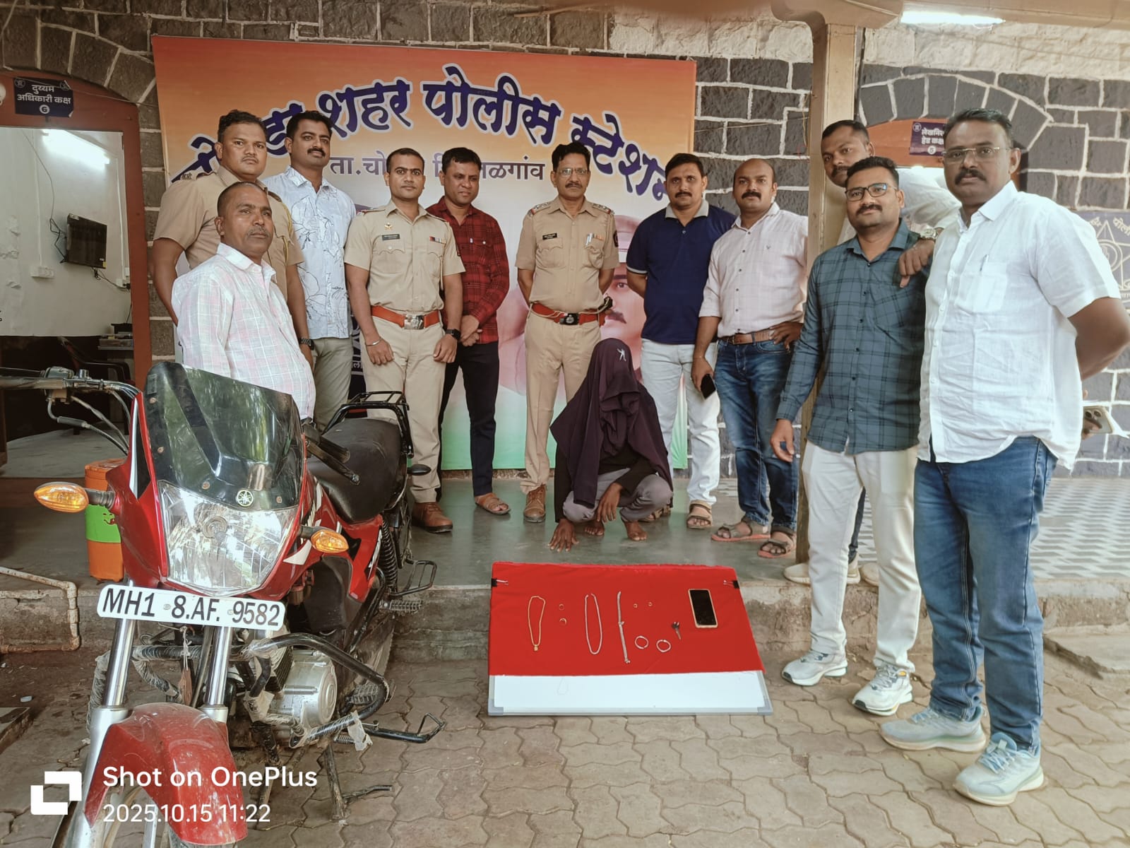 पोलिसांनी त्याच्याकडून सोन्याच्या २ अंगठ्या व ३ सोन्याच्या बाळया , सोन्याची साखळी (सुमारे २० हजार रुपये किंमत) ,टेक्नोस्पार्क कंपनीचा मोबाईल , चांदीची चैन व पैंजण ,यमाहा YBR-110 दुचाकी (MH 18 AF 9582) असा एकूण मुद्देमाल किंमत १,०४,७०० रुपये जप्त केला आहे.
