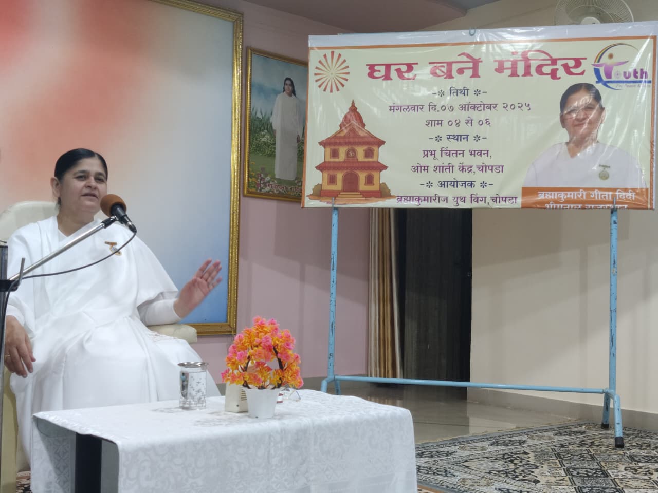 चोपडा प्रतिनिधी: “जिथे प्रेम आहे…. तेच खरे घर, जिथे आपलेपणा आहे …तिथेच आनंद, जिथे परस्पर सुसंवाद, सहकार्य आणि संवाद आहे तिथेच घर मंदिरासारखे बनते.” या प्रेरणादायी संकल्पनेवर आधारित ‘घर बने मंदिर’ हा विशेष कार्यक्रम ब्रह्माकुमारी युथ विंग, चोपडा यांच्या वतीने मंगळवार, ७ ऑक्टोबर २०२५ रोजी सायं. ४ ते ६ वाजता प्रभू चिंतन भवन, ओम शांती केंद्र, चोपडा येथे संपन्न झाला.