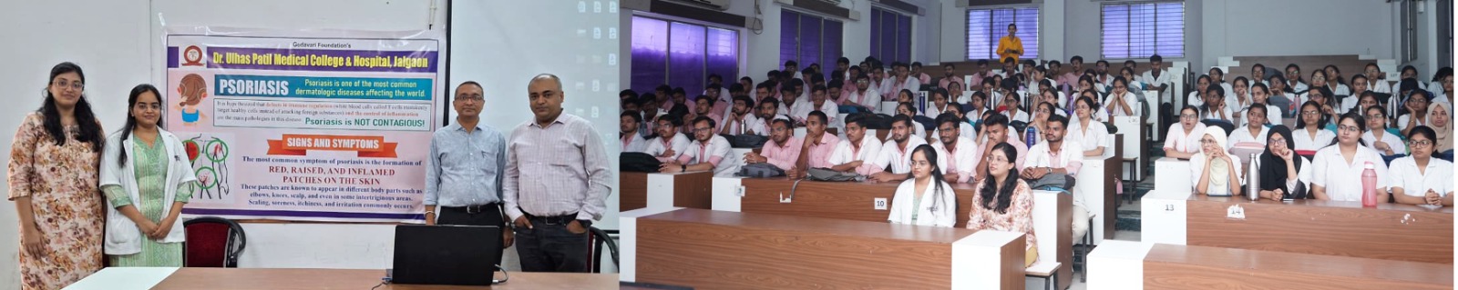 २९ ऑक्टोबर हा जागतिक सोरायसीस दिन म्हणून पाळला जातो. डॉ. उल्हास पाटील वैद्यकीय महाविद्यालयातील त्वचा विकार विभागातर्फे व्याखानाचे आयोजन करण्यात आले होते. या कार्यक्रमाला प्रमुख पाहुणे म्हणून त्वचा विकार तज्ज्ञ डॉ. पंकज तळेले हे होते. याप्रसंगी व्यासपीठावर डॉ. स्वप्नील पाटील हे उपस्थित होते. कार्यक्रमात डॉ. पंकज तळेले यांनी सोरायसीस या आजाराची लक्षणे, निदान आणि त्यावरील उपचारासंबंधी तपशीलवार माहिती दिली. त्यांनी सांगितले की, शरीराच्या कोणत्याही भागावर लालसर, जाड, खवलेयुक्त, वेदनादायक असे डाग निर्माण होतात. हा आजार संसर्गजन्य नाही आणि चुकीच्या स्वच्छतेमुळे होत नाही. त्वचेवर गोलाकार, जाड, लाल किंवा गुलाबी, खवलेयुक्त डाग निर्माण होतात. खाज, जळजळ, वेदना, किंवा पुरळ निर्माण होणे. नखांमध्ये बदल (जाड होणे, खड्डे किंवा क्रॅक पडणे). काही रुग्णांमध्ये सांध्यांमध्ये वेदना व सूज येणे. डोक्यावर, कोपर, गुडघे, पाठीचा खालचा भाग, हात, पाय, आणि टाळूला विशेषतः जास्त प्रभाव होतो. सोरायसिसविषयी गैरसमज हा त्वचा स्वच्छ न ठेवल्याने होत नाही आणि अजिबात संसर्गजन्य नाही. फक्त बाह्य आजार नाही मानसिक आरोग्यावर आणि समाजातील संबंधांवरही परिणाम करतो. वर्तमान औषधे व उपचार यामुळे आजार नियंत्रणात ठेवता येतो असेही डॉ. पंकज तळेले यांनी सांगितले.