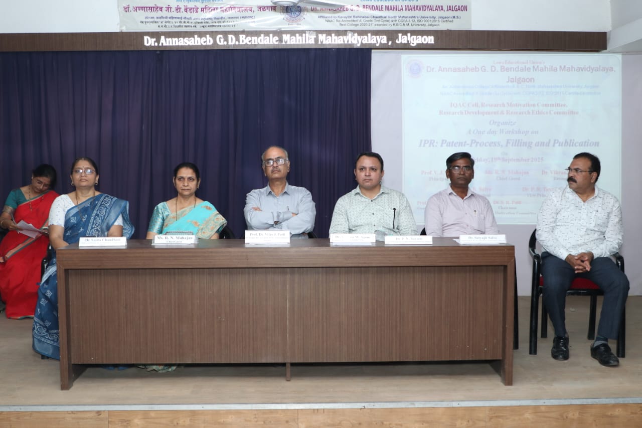 जळगाव ;- येथील डॉ. अण्णासाहेब जी.डी. बेंडाळे महिला महाविद्यालयात (स्वायत्त) आज रोजी अंतर्गत गुवत्ता हमी कक्ष (IQAC), संशोधन प्रेरणा समिती व संशोधन विकास व नैतिकता समिती यांच्या संयुक्त विद्यमाने “बौद्धिक संपदा व हक्क(IPR): पेटंट प्रक्रिया, फाइलिंग,आणि प्रकाशन ” या विषयावर एकदिवसीय कार्यशाळेचे आयोजन करण्यात आले होते. सदर कार्यशाळे साठी प्रमुख मार्गदर्शक म्हणून चाळिसगाव तेथील प्रा. डॉ.विक्रम. एम. अगोने यांनी मार्गदर्शन केले. याप्रसंगी प्रमुख अतिथी म्हणून सेवानिवृत्त प्रा. श्रीमती रत्ना महाजन या उपस्थित होत्या. अध्यक्षस्थानी महाविद्यालया चे प्राचार्य डॉ. व्ही. जे. पाटील हे उपस्थित होते.