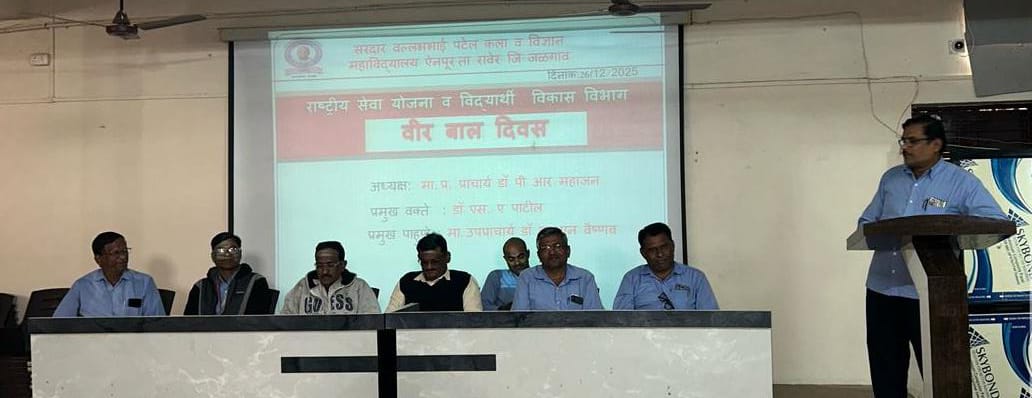 ऐनपूर (ता. रावेर) : येथील सरदार वल्लभभाई पटेल कला व विज्ञान महाविद्यालयात राष्ट्रीय सेवा योजना व विद्यार्थी विकास विभागाच्या संयुक्त विद्यमाने वीर बाल दिवस उत्साहात साजरा करण्यात आला. मा. प्राचार्य डॉ. जे. बी. अंजने यांच्या मार्गदर्शनाखाली आयोजित या कार्यक्रमाच्या अध्यक्षस्थानी प्रभारी प्राचार्य डॉ. पी. आर. महाजन होते, तर प्रमुख वक्ते म्हणून डॉ. एस. ए. पाटील यांनी विद्यार्थ्यांना मार्गदर्शन केले.
