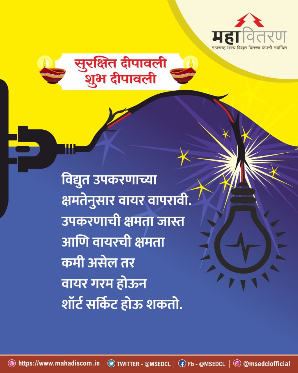 दिवाळी साजरी करताना घरगुती विद्युत उपकरणांपासूनदेखील सावध राहावे. घराच्या किंवा इमारतीच्या रोषणाईसाठी दिव्यांची विद्युत माळ चांगल्या दर्जाची असल्याची खात्री करून घ्यावी. विद्युत माळेचे वायर, दिवे, सॉकेट दर्जेदार नसल्यास धोका निर्माण होऊ शकतो. घर किंवा इमारतीचे अर्थिंग योग्य असल्याची तपासणी करावी. घराबाहेर आकाशकंदील लावताना तुटलेल्या वायरचा वापर टाळावा किंवा तुटलेली वायर चांगल्या दर्जाच्या इन्सुलेशन टेपने सुरक्षित करून घ्यावी. घरगुती उपकरणांसह विद्युत माळेपासून सुरक्षित अंतरावर तेलाच्या वातीचे दिवे लावावेत. विद्युत सॉकेटवर अधिकचा भर टाकू नये. आकाश कंदिल किंवा दिव्यांच्या विद्युत माळेसाठी श्री पीनचा वापर न करता वायर्स थेट प्लगच्या छिद्रात आगपेटीच्या काड्यांच्या साह्याने खोचले जातात. त्यामुळे त्या प्लगमध्ये स्पार्किंग होऊन आग लागण्याची शक्यता असते. गॅलरीमधील लोखंडी जाळी किंवा घराचा लोखंडी जिना किंवा इतर कोणत्याही लोखंडी वस्तूपासून विद्युत दिव्यांची व आकाश कंदिलाची वायर दूर ठेवावी. ही वायर एकसंध असावी. तुटलेली किंवा सेलो टेपने जोडलेली नाही याची खात्री करून घेण्याचे आवाहन महावितरणने केले आहे.