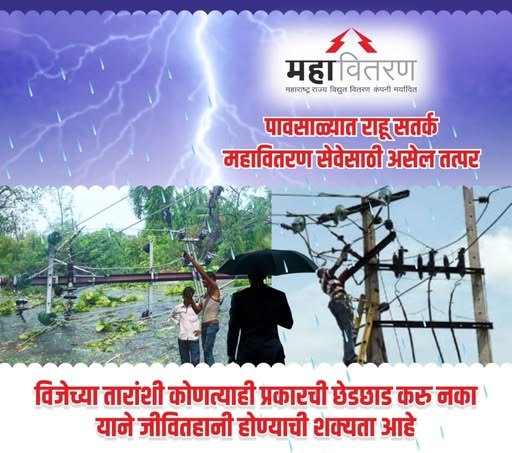 जळगाव : पावसाळ्यात वादळी व संततधार पाऊस किंवा पूरपरिस्थिती, झाडे व फांद्या कोसळल्याने तुटलेल्या वीजतारा, विजेची उपकरणे किंवा यंत्रणेमधील शॉर्टसर्किट आदींमुळे विद्युत अपघात होण्याची शक्यता असते. नागरिकांनी सार्वजनिक व घरगुती विद्युत यंत्रणा, उपकरणांपासून सावध राहावे, सर्व प्रकारची खबरदारी घेऊन सजग व सुरक्षित राहावे, असे आवाहन महावितरणने केले आहे.