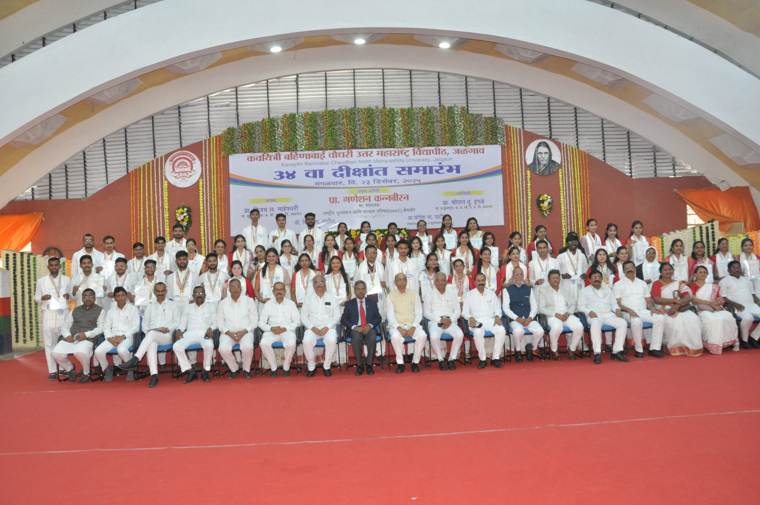 कवयित्री बहिणाबाई चौधरी उत्तर महाराष्ट विद्यापीठाचा ३४ वा दीक्षांत समारंभ मंगळवार दि. २३डिसेंबर रोजी उत्साहात संपन्न झाला. या समारंभात दीक्षांत भाषण करतांना प्रा. गणेशन कन्नबीरन बोलत होते. यावेळी मंचावर अध्यक्षस्थानी कुलगुरू प्रा. व्ही.एल. माहेश्वरी, प्र-कुलगुरू प्रा. एस.टी. इंगळे, कुलसचिव डॉ.विनोद पाटील, परीक्षा व मूल्यमापन मंडळाचे संचालक प्रा.योगेश पाटील तसेच व्यवस्थापन परिषदेचे सदस्य सर्वश्री राजेंद्र नन्नवरे, प्रा. अनिल डोंगरे, प्रा. साहेबराव भूकन, प्राचार्य जगदीश पाटील, प्राचार्य एस.आर. राजपूत, प्रा.जे.व्ही. साळी, प्राचार्य संजय सुराणा, प्रा. शिवाजी पाटील, प्रा. सुरेखा पालवे, नितीन झाल्टे, प्रा. महेंद्र रघुवंशी, डॉ.पवित्रा पाटील, डॉ. पराग मसराम, सीए रवींद्र पाटील हे उपस्थित होते.