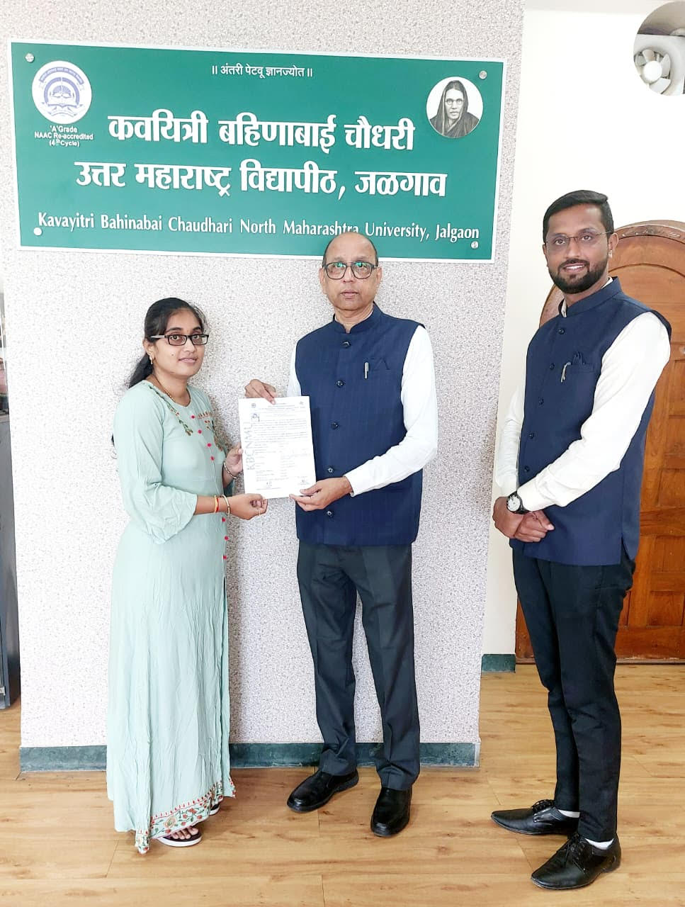 या विषयातून त्यांना पीएच डी. पदवी प्रदान करण्यात आली आहे. दरम्यान दि. १७/०९/२०२५ रोजी क.ब.चौ.उ.म.वी चे कुलगुरू मा.प्रा.विजय माहेश्वरी सर व प्र-कुलगुरू मा.प्रा.एस.टी. इंगळे सर यांनी त्यांचे नोटिफिकेशन देऊन कौतुक केले.