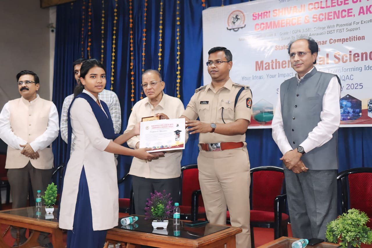 श्री.शिवाजी कॉमर्स, आर्ट & सायन्स कॉलेज अकोला येथे राज्यस्तरीय सेमिनार दिनांक 15 रोजी मॅथेमॅटिकल सायंसेस या विषयावर आयोजित करण्यात आला होता. राज्यभरातून विविध महाविद्यालयातील विज्ञान शाखेतील विविध विद्यार्थ्यांनी यामध्ये सहभाग घेतला होता. त्यामध्ये इलेक्ट्रॉनिक्स, फिजिक्स, कम्प्युटर सायन्स, मॅथेमॅटिकस, सांख्यिकी शास्त्र या विषयाचे विद्यार्थी सहभागी झाले होते. गो. से. महाविद्यालयातील शुभम पारखे, अभय नुपनारायण, विशाल पवार, कु. श्रुतिका चव्हाण, कु. दिव्या मुऱ्हेकर या पाच विद्यार्थ्यांनी या राज्यस्तरीय सेमिनार मध्ये सहभाग घेतला होता. त्यामध्ये कुमारी दिव्या मुऱ्हेकर बीएससी भाग २ हिने LiFi टेक्नॉलॉजी या विषयावर प्रकाश गतीने डाटा वायरलेस ट्रान्सफर कसा होतो याविषयीचा अभ्यास प्रस्तुत सेमिनारमध्ये विस्तृतपणे सेमिनार सादर केला. प्रस्तुत विषयाच्या अनुषंगाने उल्लेखनीय मांडणी करून आपल्या अभ्यासाची छाप या सेमिनारमध्ये पाडली. तिला यावेळी मान्यवरांच्या उपस्थितीत इलेक्ट्रॉनिक्स या विषयात तिसऱ्या क्रमांकाचे बक्षीस मिळाले यात तिला कॅश प्राईझ १५०१, मेमॉन्टो आणि सर्टिफिकेट देऊन सत्कार करण्यात आला. त्याबद्दल संस्थेचे मा अध्यक्ष डॉ. सुभाषजी बोबडे, सचिव डॉ. प्रशांतजी बोबडे तसेच महाविद्यालयाचे प्राचार्य डॉ. डी. एस. तळवणकर, यांनी तिने संपादन केलेल्या यशाबद्दल अभिनंदन व कौतुक केले आहे. विद्यार्थ्यांना व्यवस्थित मार्गदर्शन मिळाल्यास काही संशोधनात्मक गोष्टी पुढे येऊ शकतात. अनेक विद्यार्थी आपल्या विषयात अभ्यासपूर्ण रूची दाखवतात विज्ञान प्रदर्शनी, सेमिनार, नाविन्यपूर्ण उपक्रम यामध्ये सहभाग घेऊन महाविद्यालयाचा लौकिक वाढवतात याचा अभिमान संस्थेला आहे. विषय मार्गदर्शकांनी विद्यार्थ्यांच्या कल्पक बुद्धीला दिशा देण्याचे काम केल्यास असे यश संपादन करता येते. असा विश्वास माननीय प्राचार्यांनी तिचे कौतुक करताना व्यक्त केला. यावेळी इलेक्ट्रॉनिक्स विभागाचे विभाग प्रमुख प्रा. के. के. पठाण, डॉ. जे. एस.तातेड, प्रा. आय. जे. कराळे, डॉ. वाय. एस. म्हैसागर, श्री अंकुश माळवंदे आदींनी तिचे भरभरून कौतुक केले आहे. अशी माहिती एका प्रसिद्धी पत्रकाद्वारे प्रसिद्धी प्रमुख प्रा. डॉ. मोहम्मद रागिब देशमुख यांनी दिली आहे.