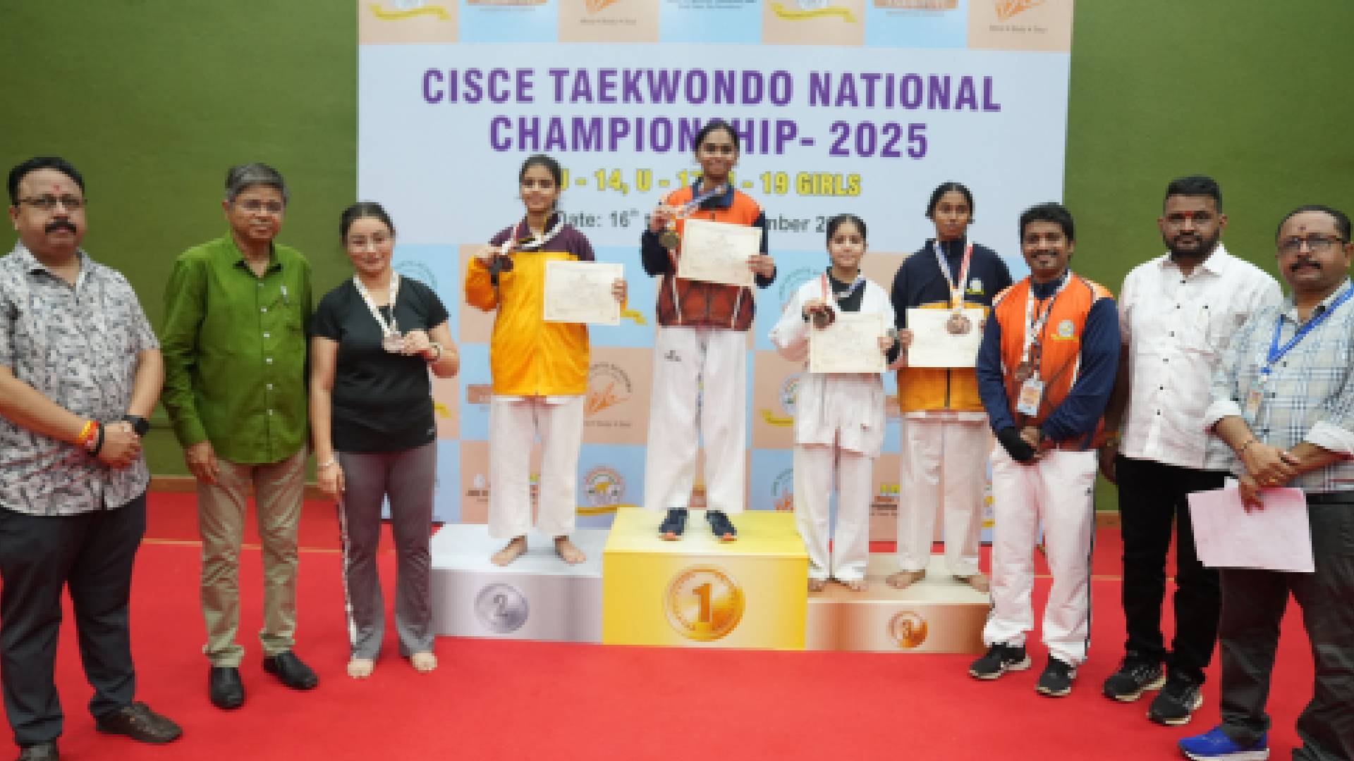 जळगाव प्रतिनिधी – सीआयएससीई सहाव्या राष्ट्रीय तायक्वांडो स्पर्धेत आजच्या सलामीच्या पहिल्या दिवशी महाराष्ट्रातील खेळाडूंनी आघाडी घेत ११ पदके मिळाले. ५ सुवर्ण, २ रौप्य आणि ४ कांस्य पदकांची कमाई केली. त्यात जळगावच्या अनुभूती स्कूलच्या विद्यार्थिनींनी पहिल्याच दिवशी तीन पदके मिळवून आपला ठसा उमटवीत महाराष्ट्राच्या वर्चस्वात मोलाची कामगिरी केली. १८ सप्टेंबर रोजी उर्वरित गटातील सामने आणि पारिषोतिक वितरण समारंभ होणार आहे.