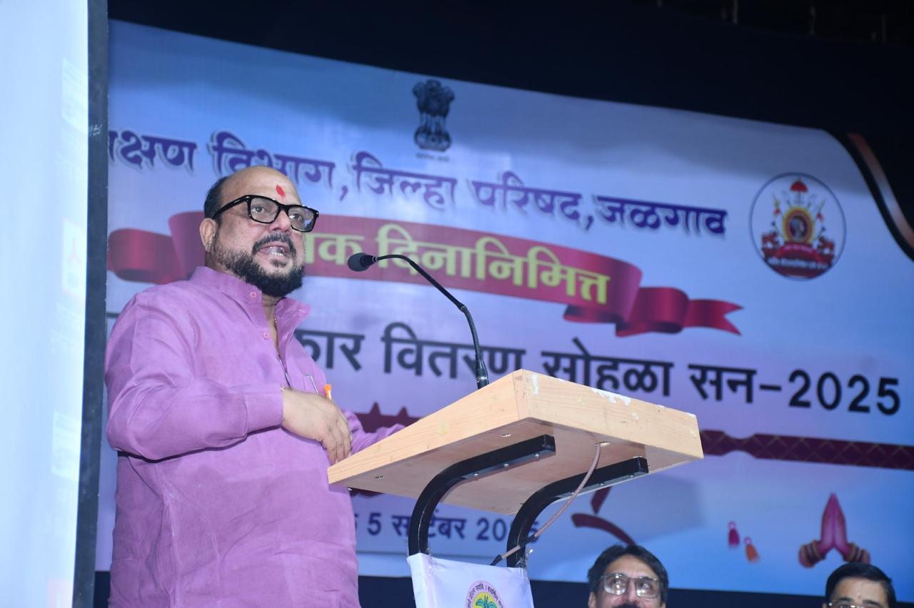 यावेळी बोलतांना आमदार राजू मामा भोळे आपल्या भाषणात म्हणाले की,जळगाव जिल्ह्यात शिक्षणाच्या बाबतीत अत्यंत नव नवीन प्रयोग सुरू आहेत. पालकमंत्र्यांच्या माध्यमातून जिल्ह्यातील शाळांना संरक्षण भिंत बांधण्यासाठी उभारण्यासाठी मोठ्या प्रमाणात निधी उपलब्ध करून देण्यात आला आहे.या मुळे शाळांना नविन स्वरूप प्राप्त झाले आहे.शिक्षण ही जीवनाची गंगोत्री आहे तसाच शिक्षक हा प्रत्येकाच्या जीवनातील अविभाज्य घटक आहे. त्यामुळे या पुरस्काराच्या माध्यमातून शिक्षकांची जबाबदारी आणखीनच वाढली आहे असेही आमदार भोळे या वेळी म्हणाले.