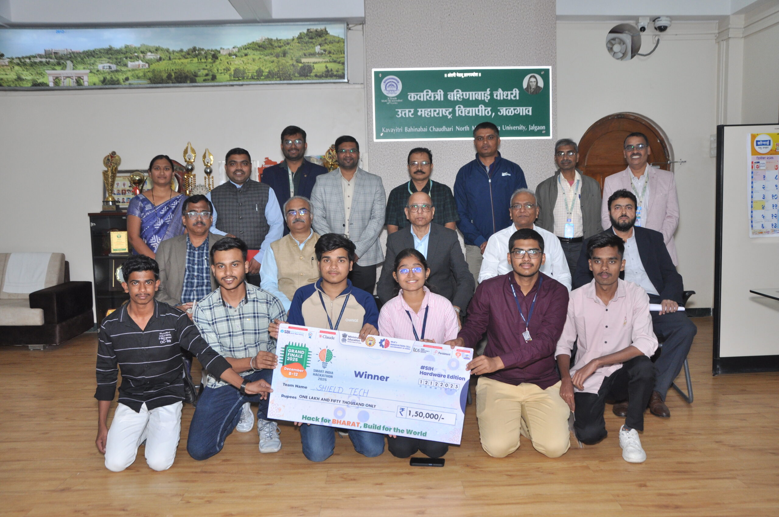 जळगाव प्रतिनिधी: कवयित्री बहिणाबाई चौधरी उत्तर महाराष्ट्र विद्यापीठ, जळगाव येथील विद्यापीठीय रसायन तंत्रज्ञान संस्था (UICT) मधील ‘शिल्ड टेक’ या विद्यार्थीसंघाने (दिपांशू रहांगडाले, नेत्रदीप कदम, चैतन्य सातपुते, प्राजक्ता लंके, भार्गव रायकऱ आणि साहिल झांबरे) स्मार्ट इंडिया हॅकाथॉन २०२५ मध्ये अखिल भारतीय विजेतेपद पटकावून विद्यापीठाच्या शिरपेचात मानाचा सर्वोच्च तुरा रोवला आहे. कुलगुरू प्रा.व्ही.एल. माहेश्वरी यांनी या विद्यार्थ्यांचा अभिनंदनपर सत्कार केला.