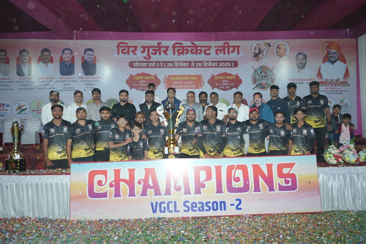 जळगाव – चोपडा शहरात २४ ते २८ डिसेंबर दरम्यान आयोजीत वीर गुर्जर क्रिकेट लीगच्या दुसऱ्या सत्राच्या अंतीम सामन्यात अथर्व ट्रॅव्हल्सच्या संघाने क्वॉलीटी मेटल्स संघावर तब्बल ३९ धावांनी मात करून, सलग दुसऱ्यांदा विजेतेपद मिळवले आहे. राज्याचे पाणी पुरवठा मंत्री तथा जिल्ह्याचे पालकमंत्री गुलाबराव पाटील यांच्या हस्ते विजेत्या संघाला पारितोषीक वितरण करण्यात आले.