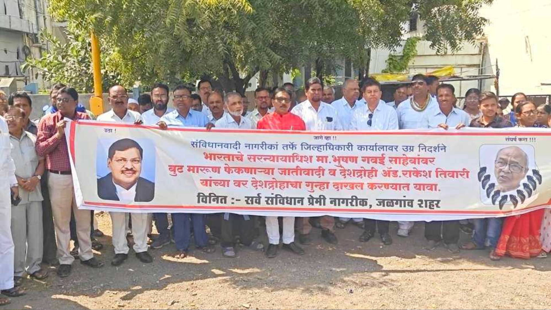 जळगाव प्रतिनिधी सर्वोच्च न्यायालयाचे सरन्यायाधीश भूषण गवई यांच्यावर कोर्टात बूट फेकणाऱ्या अॅड. राकेश तिवारी याच्याविरोधात देशद्रोहाचा गुन्हा दाखल करण्याच्या मागणीसाठी जळगावात संविधान प्रेमी नागरिक, सामाजिक संघटना आणि बहुजन समाज घटकांनी एकत्र येत तीव्र आंदोलन करून जिल्हाधिकारी कार्यालयावर मोर्चा काढला .