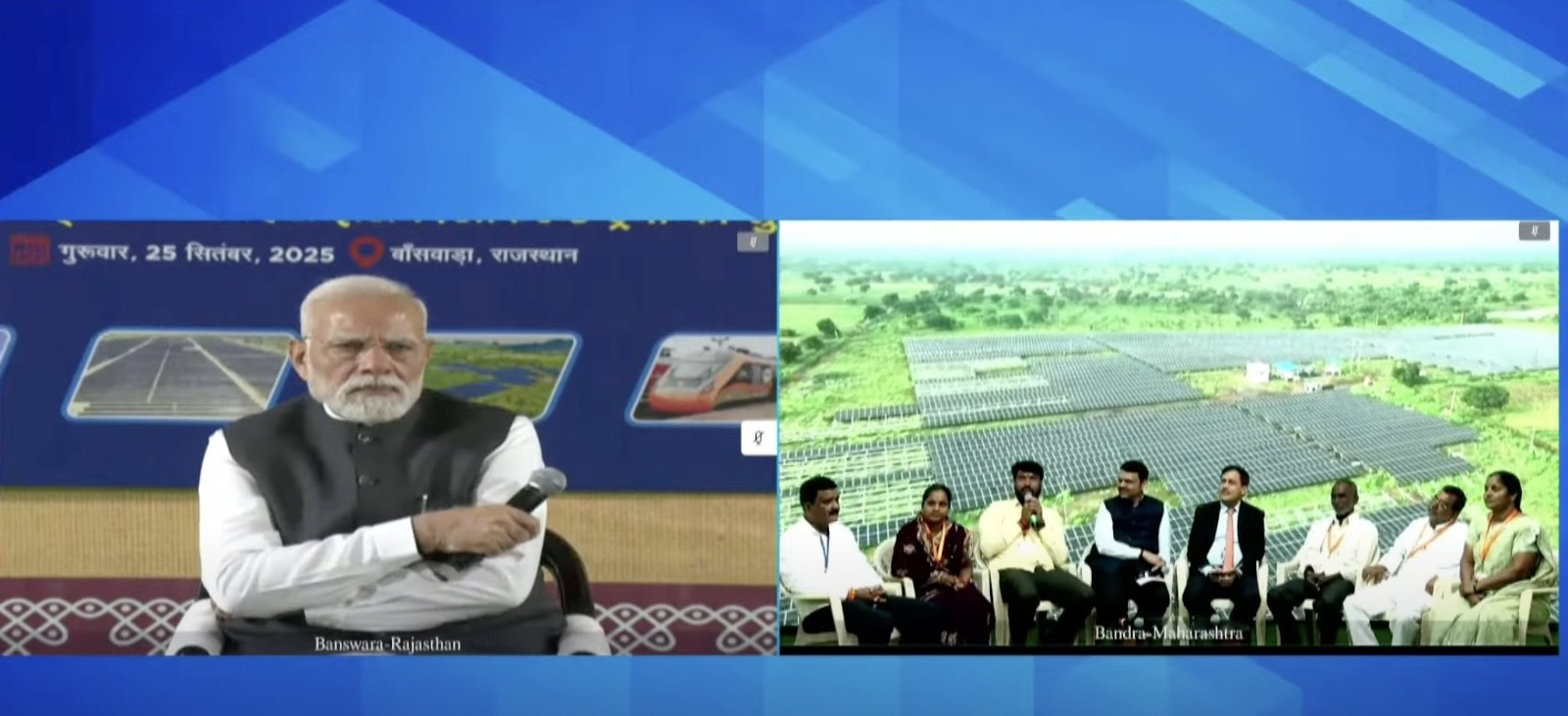 राजस्थान बांसवाडा येथे ऊर्जा तसेच विविध विकास योजनांचा लोकार्पण कार्यक्रम पार पडला. या कार्यक्रमाचे ऑनलाईन प्रक्षेपण बांद्रा पूर्व प्रकाशगड येथून करण्यात आले. यावेळी मुख्यमंत्री देवेंद्र फडणवीस, महावितरणचे अध्यक्ष तथा व्यवस्थापकीय संचालक लोकेश चंद्र, महानिर्मितीचे व्यवस्थापकीय संचालक राधाकृष्णन बी, राज्यातील पी एम कुसुम सी – मुख्यमंत्री सौर कृषी वाहिनी योजना २.० आणि पी एम कुसुम बी – मागेल त्याला सौर कृषी पंप योजनेचे लाभार्थी शेतकरी उपस्थित होते. या कार्यक्रमात प्रधानमंत्री नरेंद्र मोदी यांनी राज्यातील सौर ऊर्जा प्रकल्पातील विविध लाभार्थ्यांशी संवाद साधला.
