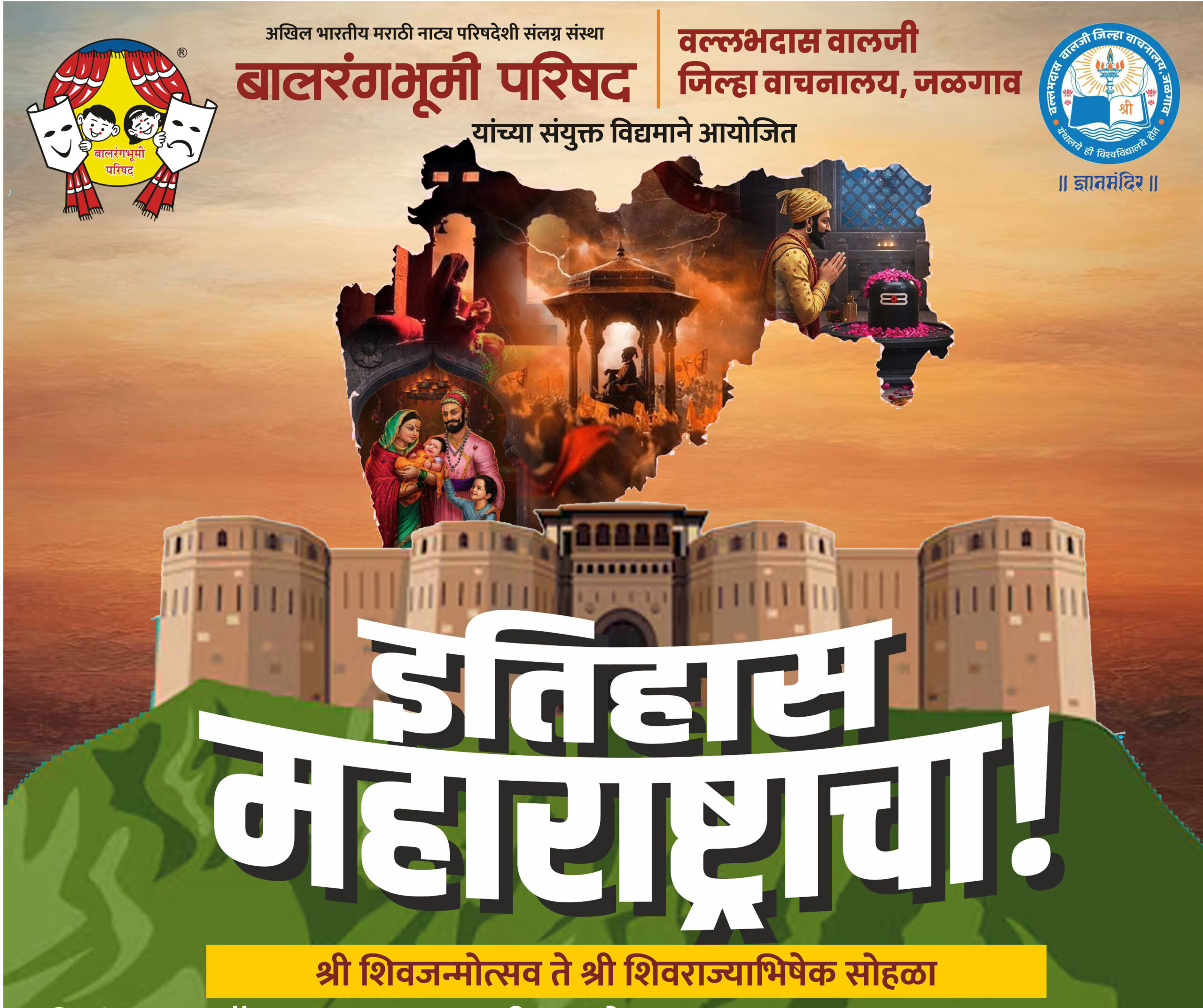 बालरंगभूमी परिषद जळगाव जिल्हा शाखा व व.वा. जिल्हा वाचनालय यांच्या संयुक्त विद्यमाने दि. १२ ऑगस्ट रोजी सकाळी ९ वाजेपासून वल्लभदास वालजी जिल्हा वाचनालयाच्या स्टेशनरोडवरील सभागृहात प्राथमिक फेरी होणार आहे. या उपक्रमात एकल गटात वय वर्षे ५ ते १० व वय वर्षे ११ ते १५ या वयोगटात तसेच समूह गट अशी विभागणी करण्यात आली आहे. एकल गट १ वय वर्षे ५ ते १० यांना छत्रपती शिवाजी महाराज तर एकल गट २ वय वर्षे ११ ते १५ व समूह गट यांना छत्रपती शिवाजी महाराज जन्मोत्सव ते राज्याभिषेक हा विषय देण्यात आला आहे. एकल गटात स्पर्धकांनी स्वतः छत्रपती शिवाजी महाराज आहोत किंवा त्याकाळातील कोणत्याही व्यक्तिरेखेच्या सहाय्याने छत्रपती शिवाजी महाराज अशा स्वरुपाने तर एकल गट २ व समूह गटातील स्पर्धकांनी श्री शिवजन्मोत्सव ते श्री शिवराज्याभिषेक या कालखंडातील शौर्य घटना, विविध प्रसंग, पराक्रम आदी घटनांचे संदर्भ घेत नृत्य, नाट्य, संगीत आदींचा समन्वय साधत प्रभावी सादरीकरण करावयाचे आहे. एकल गटाकरिता जास्तीत जास्त ५ मिनिटे तर समूहाकरिता जास्तीत जास्त १० मिनिटे सादरीकरणाची मर्यादा आहे. स्पर्धेत सहभागी होण्याकरिता कोणतीही प्रवेश फी नसून, प्रत्येक सहभागी स्पर्धकाला सहभाग प्रमाणपत्र देण्यात येणार आहे.
