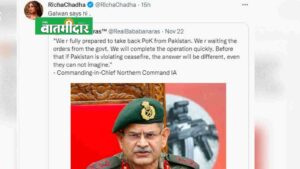 दरम्यान, उत्तर लष्कराचे कमांडर लेफ्टनंट जनरल उपेंद्र द्विवेदी यांनी मंगळवारी सांगितले होते की, पाकव्याप्त काश्मीर परत घेण्यासाठी भारत सज्ज आहे. भारतीय सेना कुठल्याही कारवाईसाठी पूर्णपणे तयार आहे. भारत सरकार जो आदेश देईल त्यासाठी आम्ही सज्ज आहोत. असं द्विवेदी म्हणाले होते. या विधानाचा संदर्भ देत रिचा चड्ढाने ट्विटरवर लिहिले की, ‘गलवान ही कह रहा है’. यानंतर भाजप नेते मनजिंदर सिंग सिरसा यांनी ट्विट करून म्हटले आहे की, ‘अभद्र ट्विट. ते लवकर मागे घेतले पाहिजे, आमच्या सशस्त्र दलांचा अपमान करणे योग्य नाही.