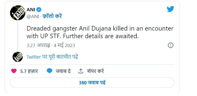दै. बातमीदार । ४ मे २०२३ । राज्यातील टॉप गुंडांपैकी एक गुंड असलेला अनिल दुजाना होता. त्याला उत्तर प्रदेशच्या स्पेशल टास्क फोर्सने गुरुवारी कुख्यात गुंड अनिल दुजाना याचा मेरठमध्ये आणखी एका चकमकीत एन्काऊंटर केला. अनेक प्रकरणांमध्ये किंवा खून आणि खंडणीमध्ये त्याचा सहभाग होता. युपी पोलिसांनी गुंड-राजकारणी बनलेल्या अतिक अहमद यांचा मुलगा असद याला एका चकमकीत मारल्याच्या काही आठवड्यांनंतर ही घटना घडली आहे.