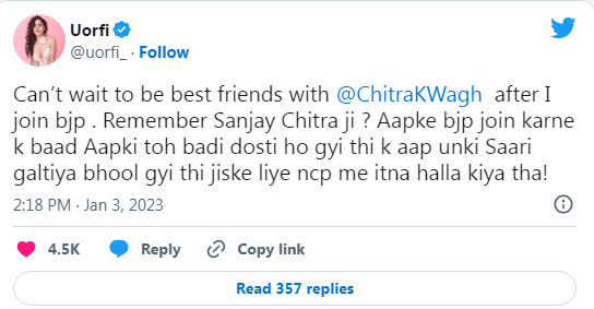 “मला माहीत आहे की राजकारण्यांविरोधात असे पोस्ट अपलोड करणे खूप धोकादायक आहे. पण या लोकांमुळे माझ्या मनात आत्महत्येचे विचार येत आहेत. एकतर मी स्वत:चा जीव तरी घेईन किंवा मग माझ्या मनातले बोलेन आणि त्यांच्याद्वारे मारली जाईन. मात्र या सगळ्याची सुरुवात मी केली नाही. मी कधीच कोणासोबत काही चुकीचे केले नाही. ही लोकं विनाकारण माझ्या मागे लागली आहेत”, असे उर्फीने लिहिले आहे.उर्फीने या आधीच्या पोस्टमध्ये चित्रा वाघ आणि संजय राठोड यांच्या मैत्रीचा उल्लेख केला होता. यात तिने चित्रा वाघ यांच्याबद्दल अनेक प्रश्न विचारले. “मी भाजपामध्ये प्रवेश केल्यावर चित्रा वाघ आपण एकमेकींच्या चांगल्या मैत्रिणी नक्कीच बनू. चित्रा जी, तुम्हाला संजय राठोड आठवतात का? तुम्ही भाजपात प्रवेश केल्यानंतर त्यांच्याशी घनिष्ठ मैत्री झाली आणि तुम्ही त्यांच्या सर्व चुका विसरलात. पण राष्ट्रवादीत असताना मात्र त्यांच्यावर अनेक आरोप केले होते,” असा उपरोधिक टोला तिने चित्रा वाघ यांना लगावला.