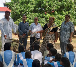महात्मा गांधीजींकडून मिळालेल्या सायकल सुभाष साळुंखे यांना देतांना कमला सहानी व त्यांची कन्या अमिया रुंगठा तर दुसऱ्या छायाचित्रात सायकलीसमवेत गांधी तीर्थचे विश्वस्त अशोक जैन तर तिसऱ्या छायाचित्रात महात्मा गांधी, जवाहरलाल नेहरू, आचार्य कृपलानी यांच्या समवेत प्रभूदयाल विद्यार्थी.