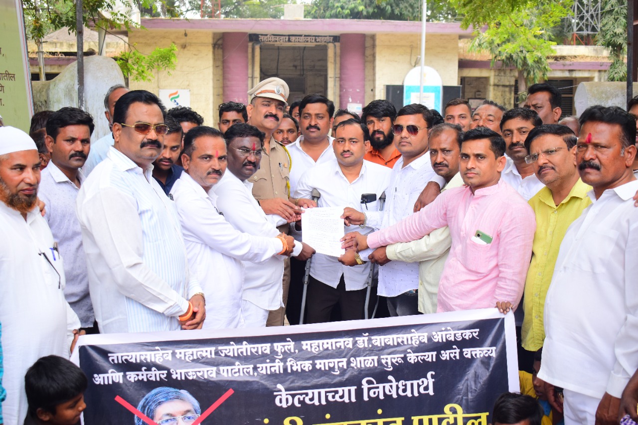 राज्याचे मंत्री चंद्रकांत पाटील यांनी महापुरुषांच्या बाबत असे म्हटले की महात्मा जोतिबा फुले,डॉ.बाबासाहेब आंबेडकर,कर्मवीर भाऊराव पाटील यांनी शाळेसाठी भिक मागून शाळा सुरू केल्या असे वाचाळ वकत्व्य केलं या वक्तव्याचा आम्ही भडगाव तालुका येथील विविध सामाजिक संघटनेच्या वतीने जाहीर निषेध करीत आहोत.
