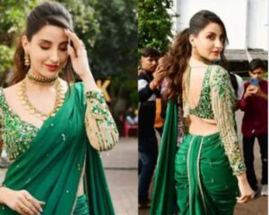 या लूकमध्ये नोरा फतेहीने पारंपरिक टच असलेली सुंदर हिरव्या रंगाची साडी परिधान केली आहे. हे फुल स्लीव्हज ब्लाउजसोबत नेले जाते. या सौंदर्यावर भारी भरतकाम करण्यात आले आहे.